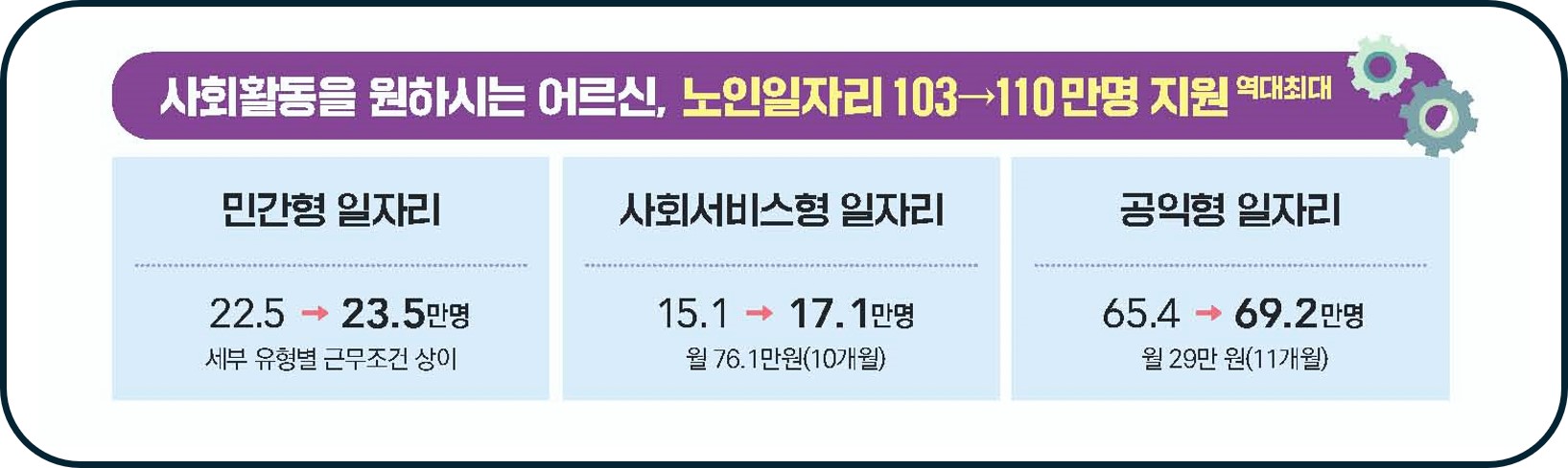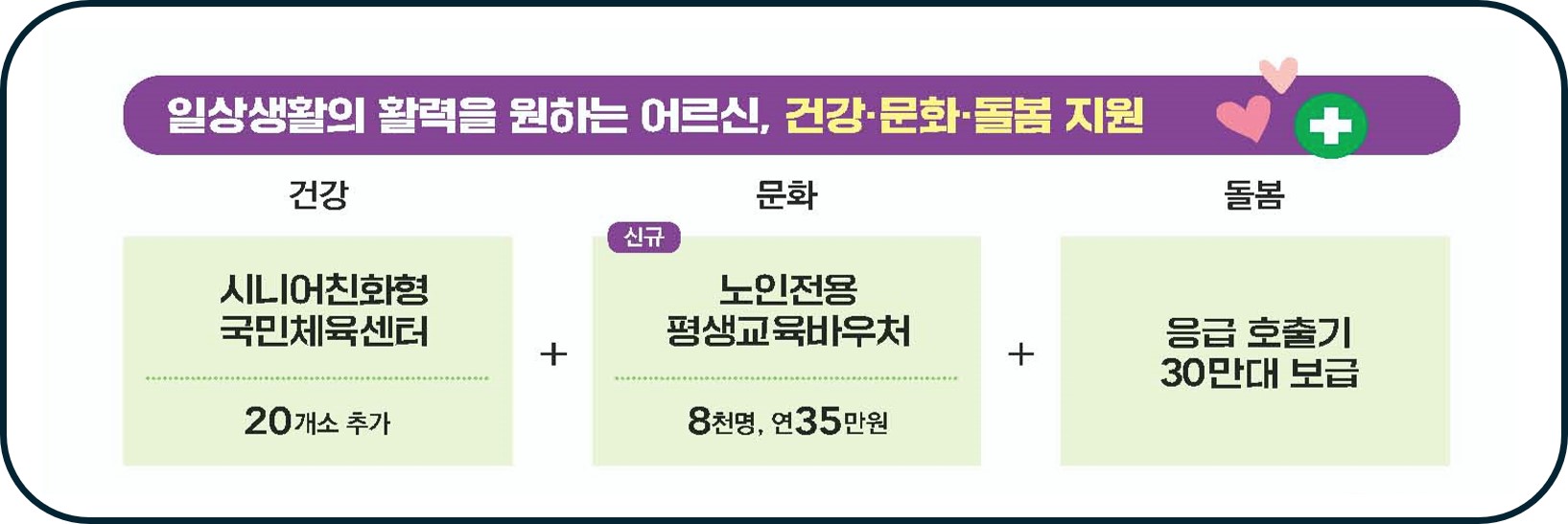 - 응급호출기 30만 대 보급: 긴급 상황에서 신속한 구조를 가능하게 하여 어르신들의 안전을 강화하고, 가족 및 사회의 돌봄 부담을 경감시킬 것으로 기대됩니다.