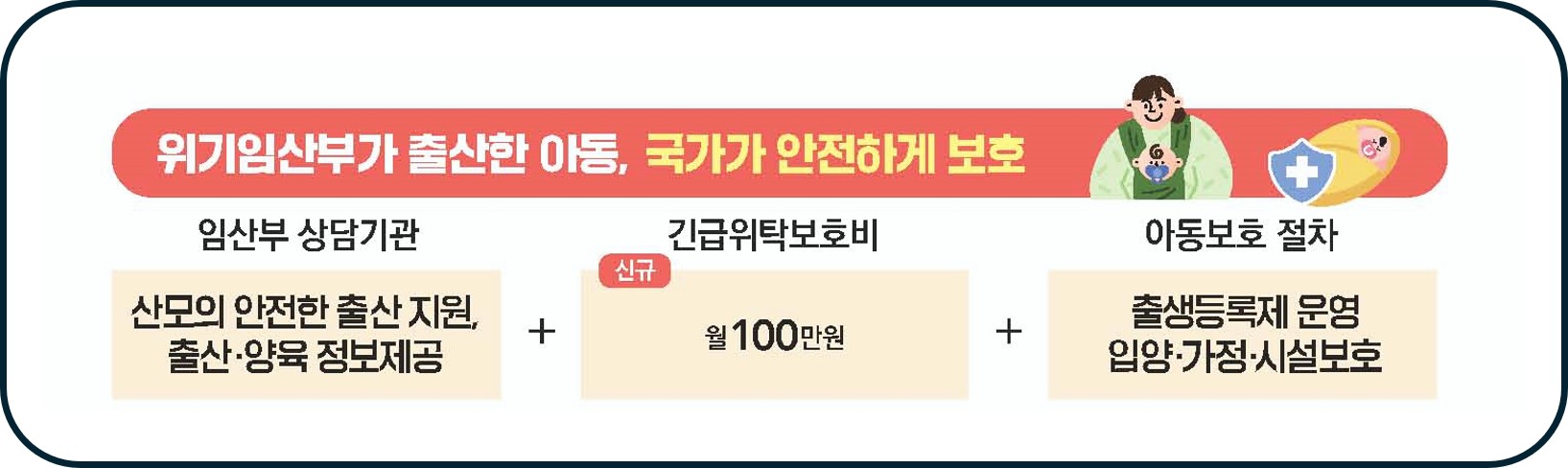 위의 사례처럼 위기임산부가 출산한 아동을 국가가 안정하게 보호해 줄 뿐만 아니라 산모의 안전한 출산을 지원해 주는 안입니다.