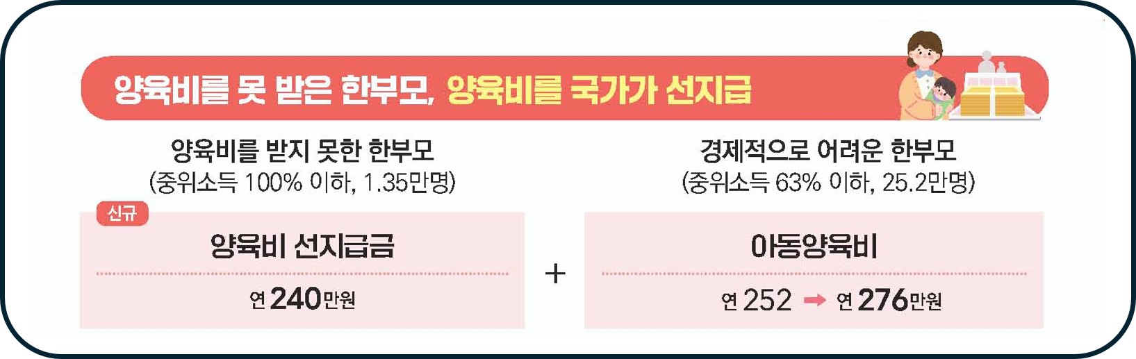 2025년 한부모, 취약 아동 지원: 자녀양육비 선지급, 위기 임산부 출산한 아동, 보호시설 퇴소 청소년 등 지원안