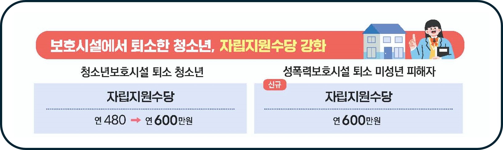 청소년 쉼터나 성폭력 보호시설 등에서 퇴소한 청소년 들은 재정적으로 자립하는데 어려움을 겪는 경우가 많습니다 . 이들의 자립을 지원해 주는 자립지원수당을 강화하여 지원할 에정입니다.